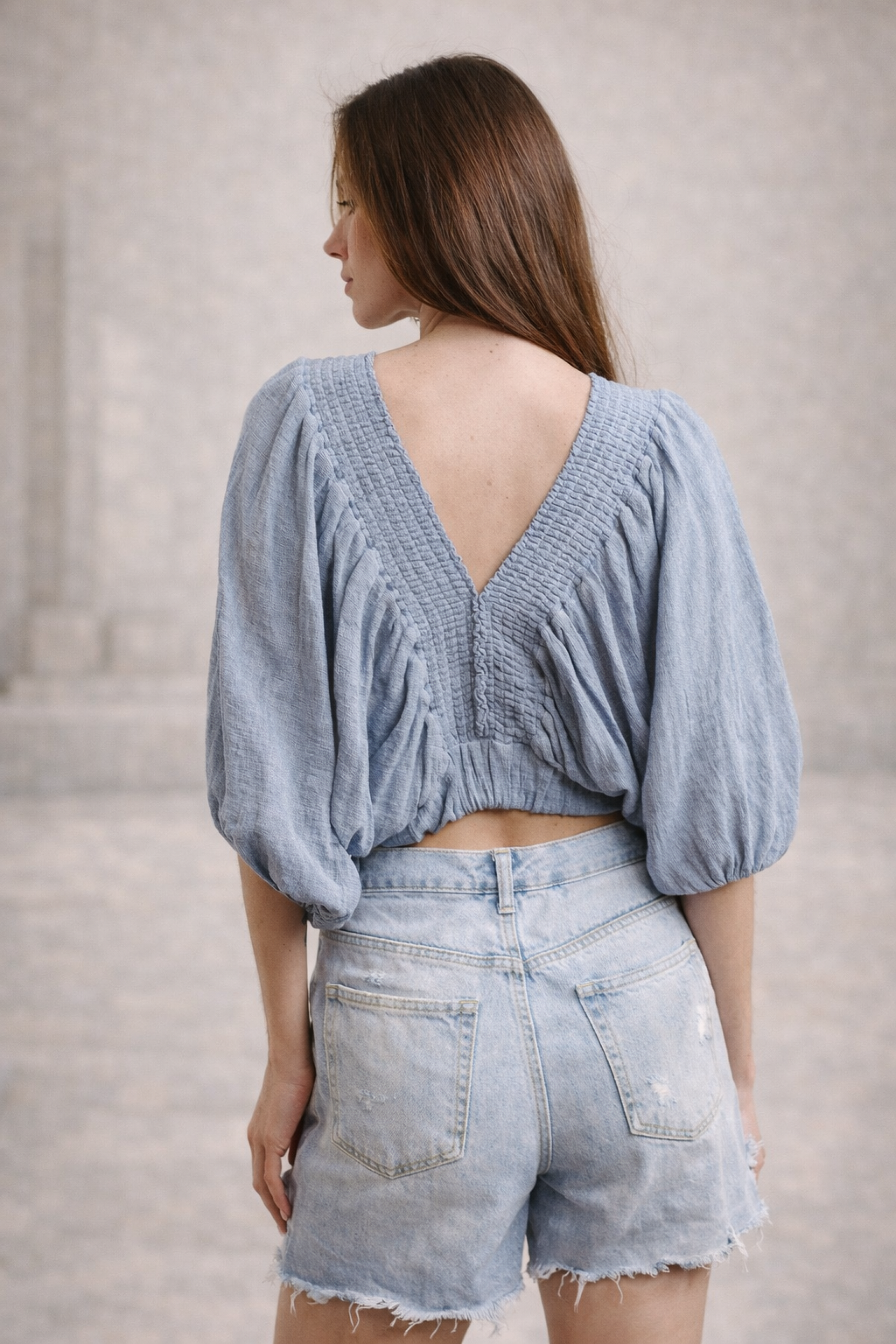 An airy cropped blouse with soft volume and gentle drape. The Lehua Crop is designed to feel light on the body while offering subtle structure through the shoulders and neckline. Perfect with high-waisted trousers or layered under knits for transitional wear.