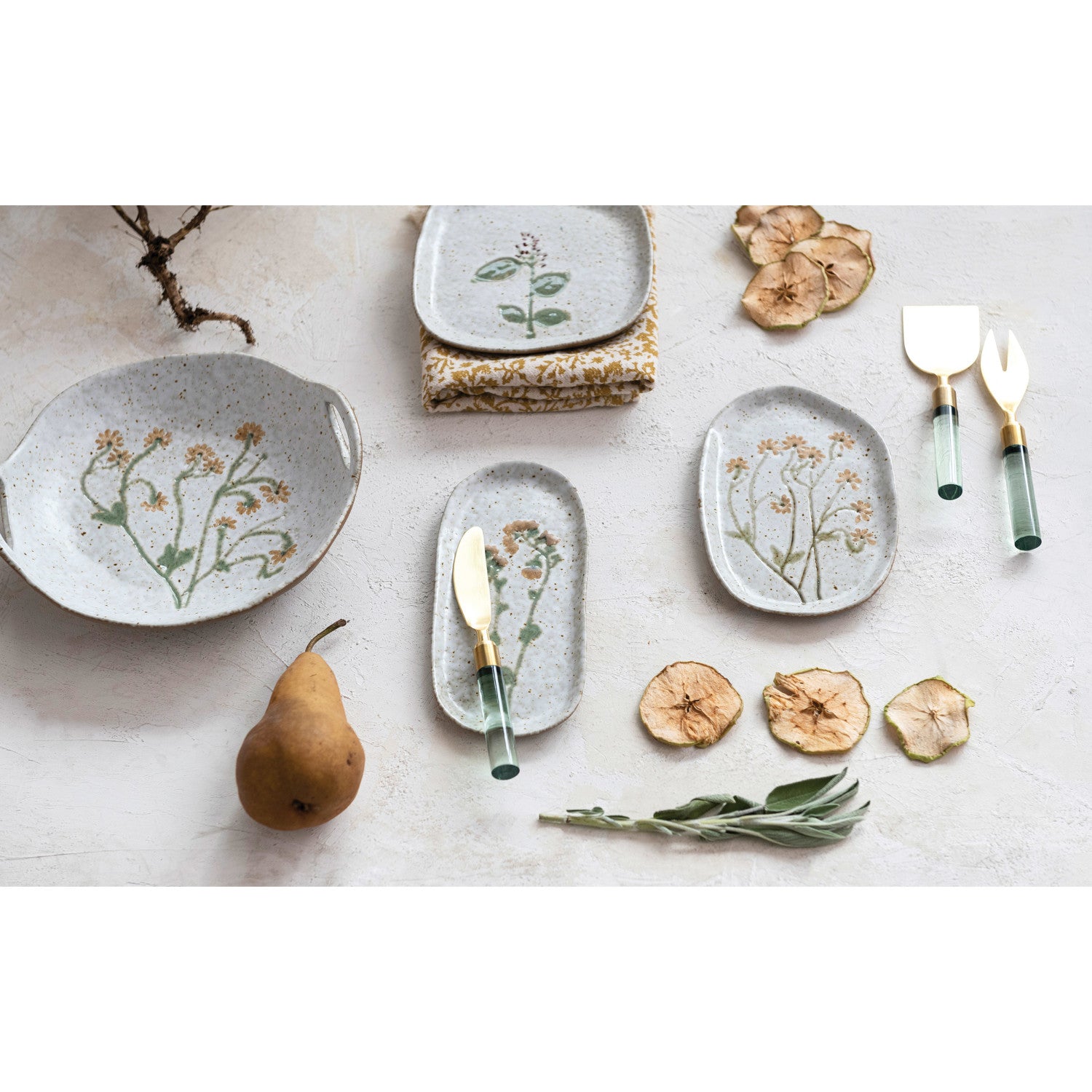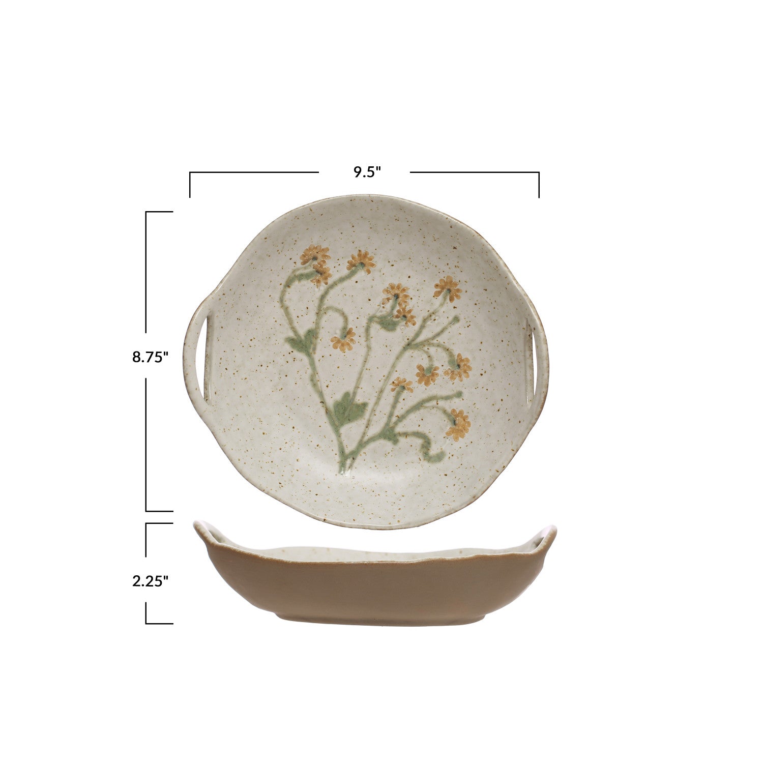 Hand-Painted Stoneware Bowl w/ Handles & Botanicals (Each One Will Vary)