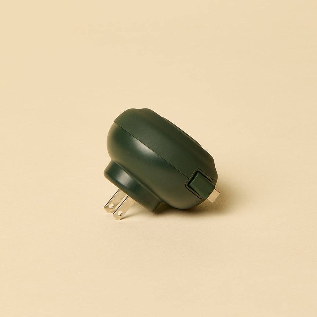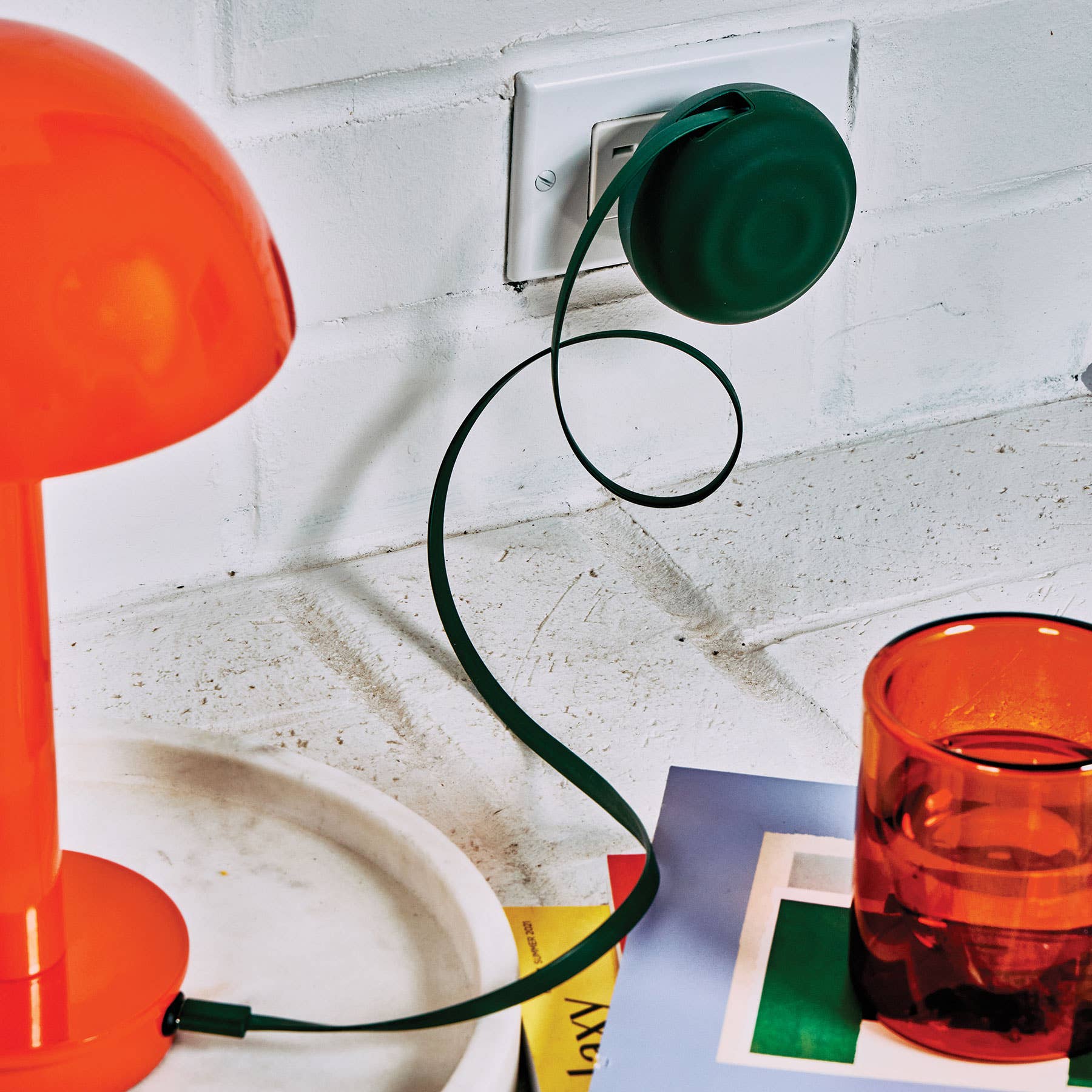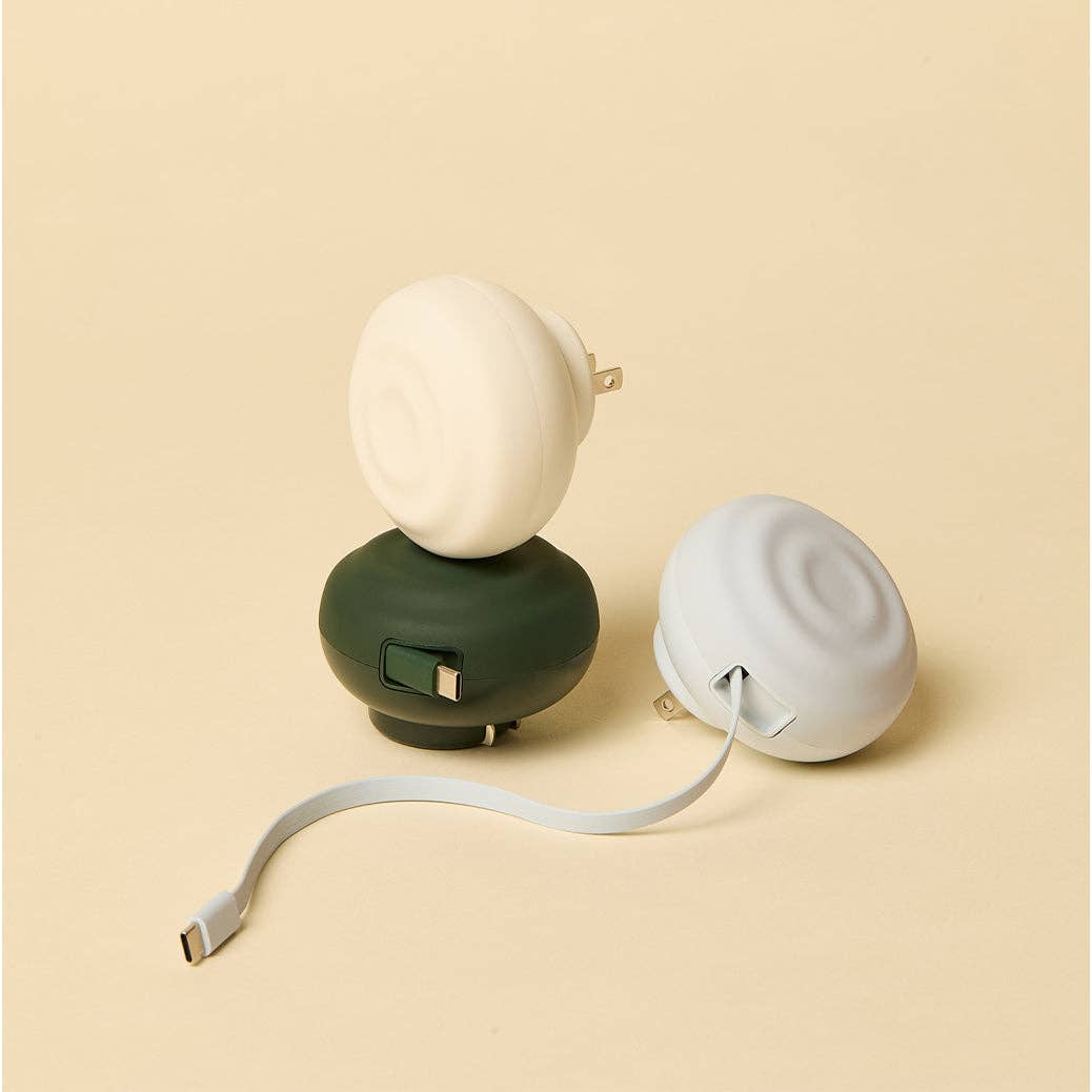 Our 35 Watt cord-retractable chargers are made of silicone and post-consumer plastic, with a button-enabled cable retractor. Their rippled, soft exteriors are both texturally satisfying and sensibly durable, protecting 4 feet of USB-C cord.
