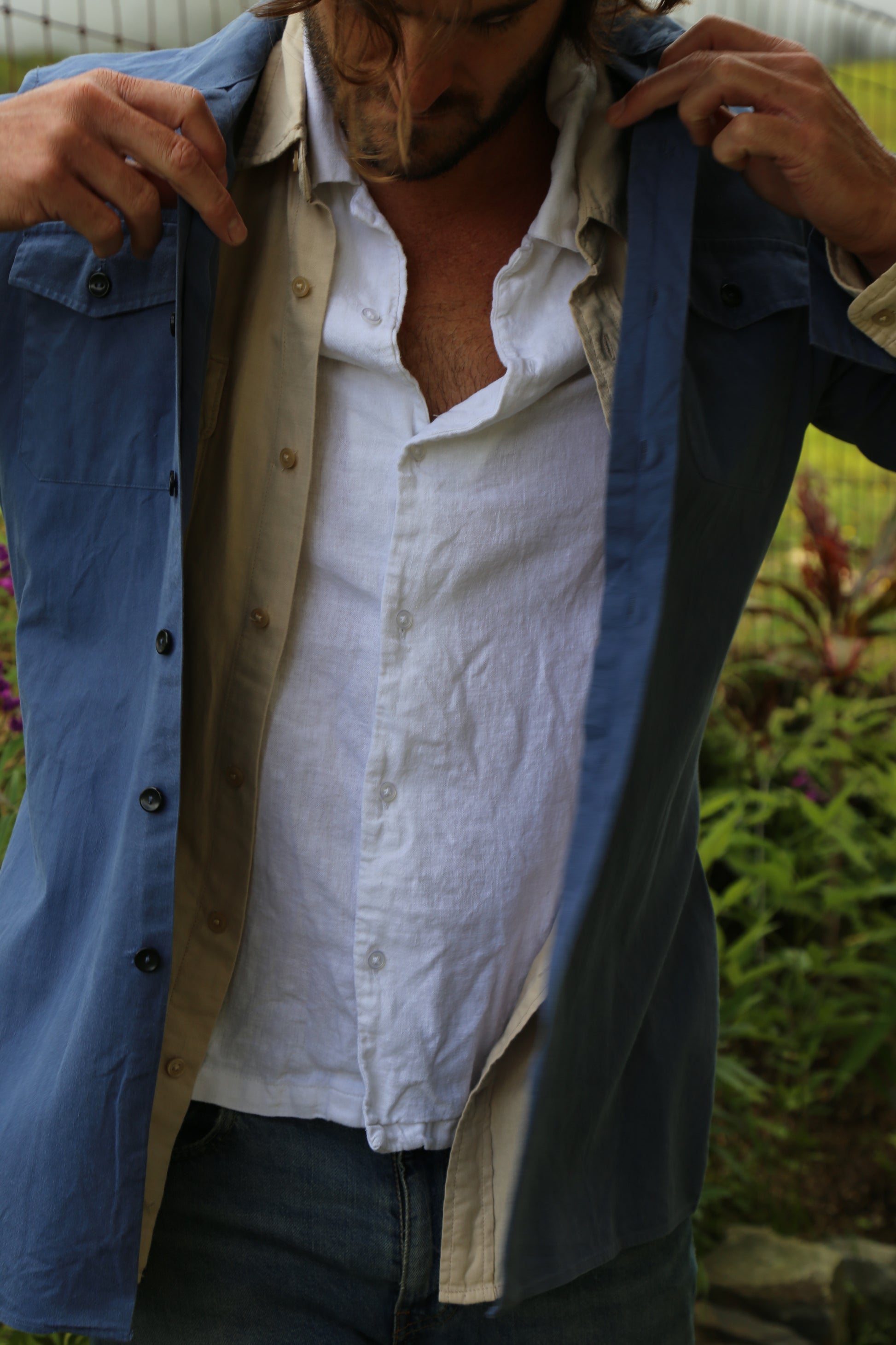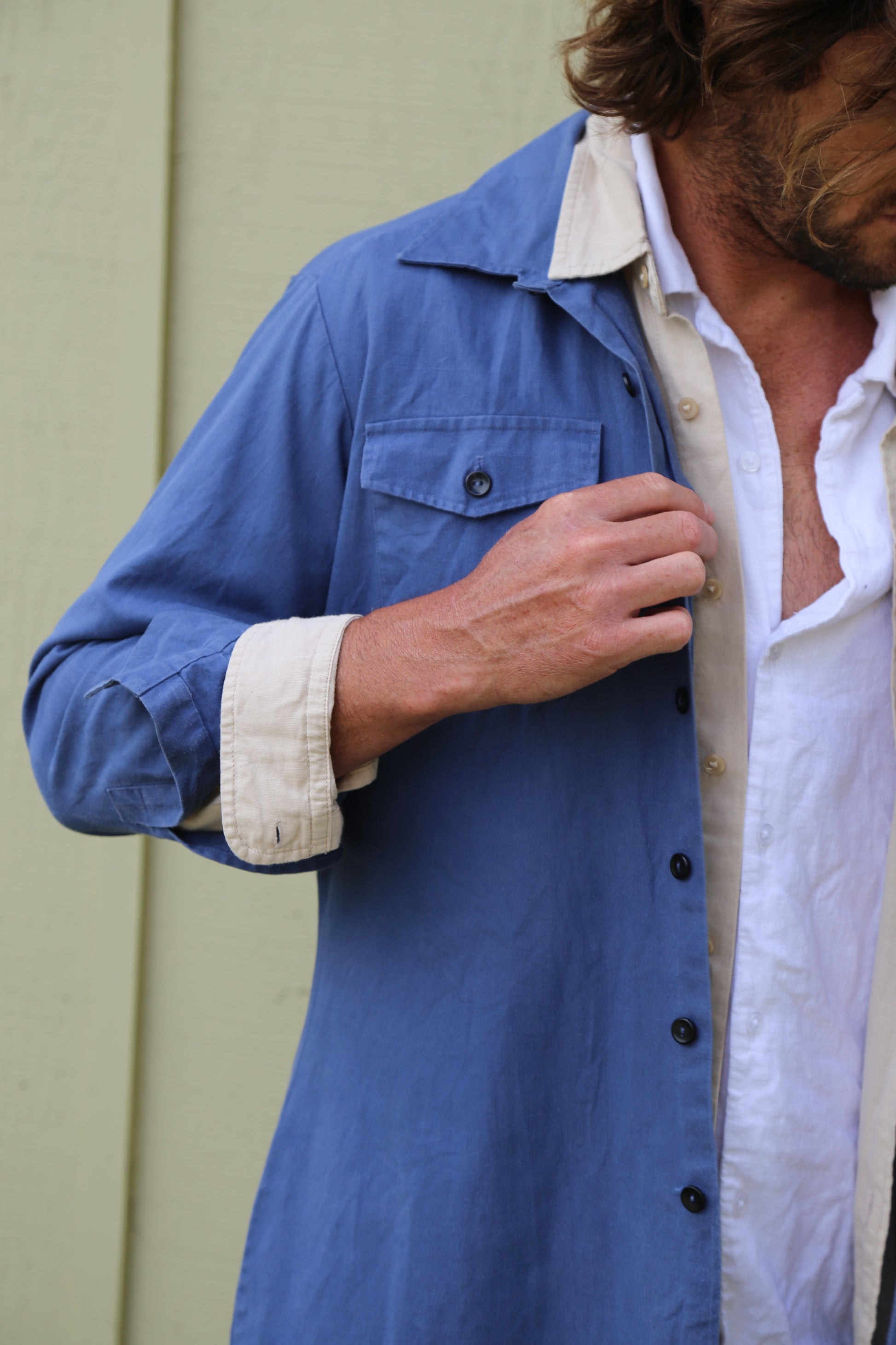 This jacket began with stacks of surplus military garments, each one carrying the marks of its past life. From these, select blue fabrics were chosen and reworked into a versatile, lightweight layer. No two pieces were alike—sleeve lengths varied, proportions shifted, and uniformity proved impossible.